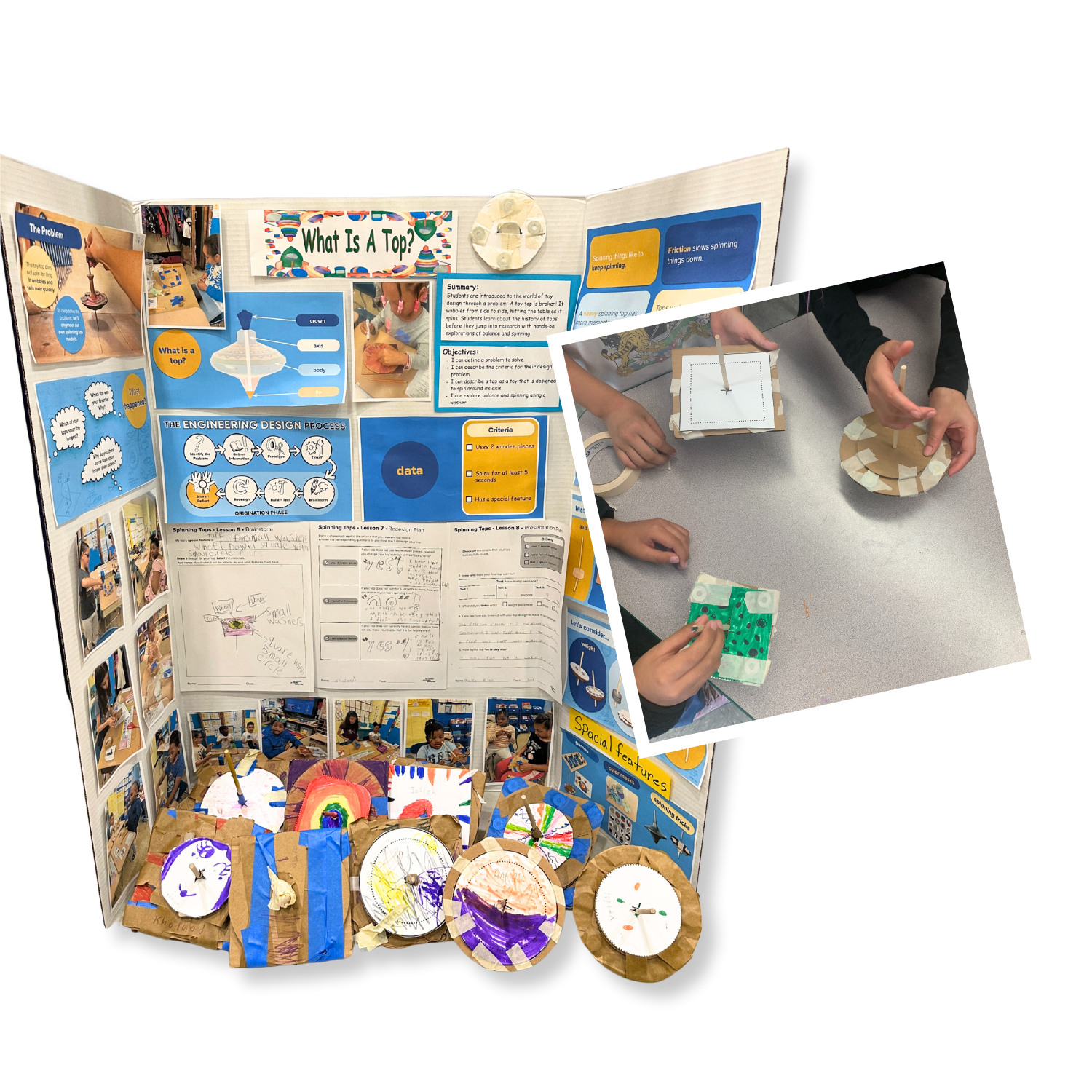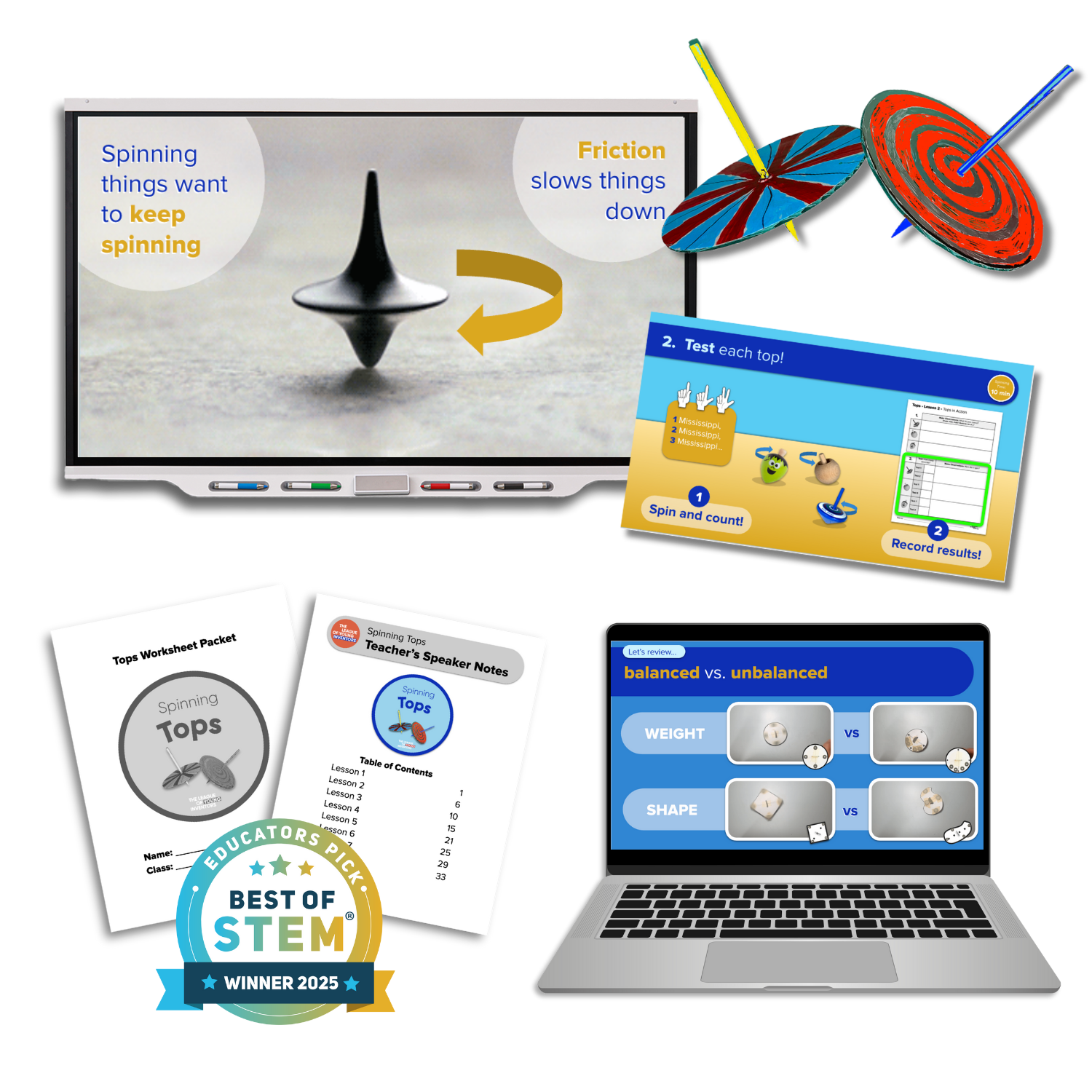 A toy inventor's top wobbles and falls before anyone can count to three. Students investigate what keeps a spinning top upright — and what brings it down. They explore how gravity, friction, and balance each affect how long and smoothly a top spins, collect spin-time data across multiple tests, and identify patterns in their results. The unit culminates in a final design challenge: engineer a top that spins for five seconds or more, complete with a personalized design feature.